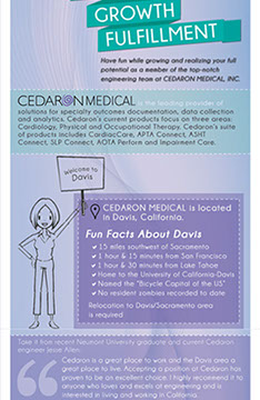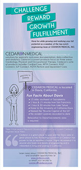 Previous to UC Davis, I worked for Cedaron Medical, a software company specializing in applications for the physical rehabilitation market. At Cedaron, I developed the training suite (17 modules) for their Connect application. I also managed their website, and worked on different graphic products ranging from brochures to promotional materials for conferences.